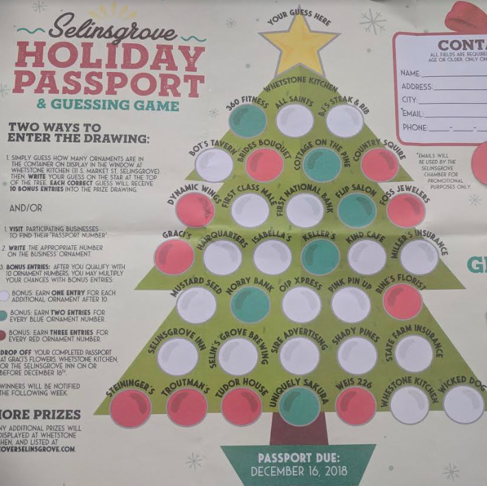 Beginning right now is the Holiday Passport and Guessing game. To play you get a holiday passport from the Selinsgrove Inn at 214 N Market St, or Graci’s flowers at 901 N Market St.