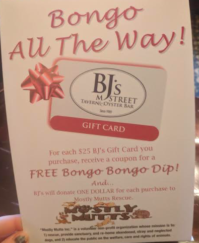 When ever you buy a $25 gift card BJ’s will also give a dollar to Mostly Mutts.