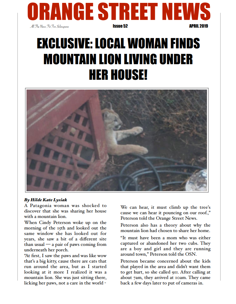 A lot of great stories in this issue! This issue including a front page follow to the mountain lion with an EXCLUSIVE picture, a disturbing short story, an update on the Marshal situation, and MUCH MORE!