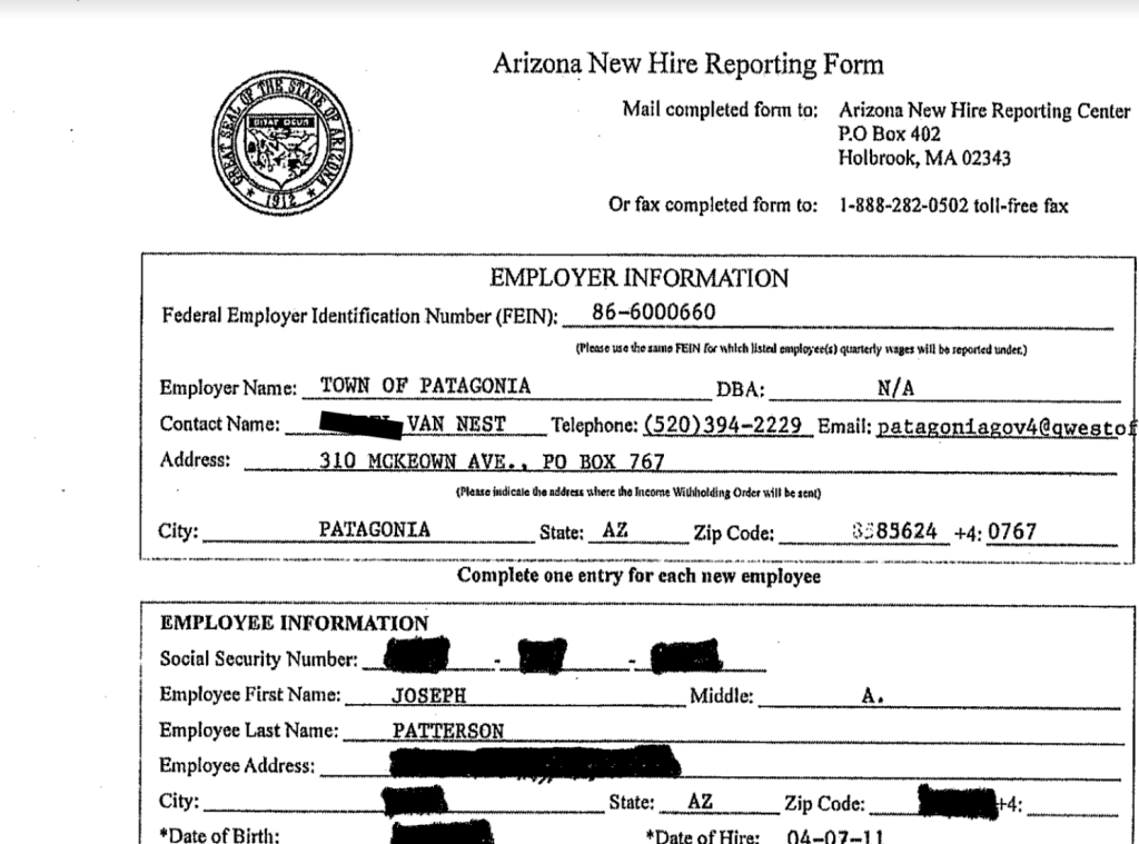 The OSN has obtained the Arizona New Hiring Form which lists the suspect’s mother as the contact name for the Town of Patagonia upon Marshal Joseph Patterson’s hiring. This isn’t a unusual in itself — his mother is a long-time worker for the town.
