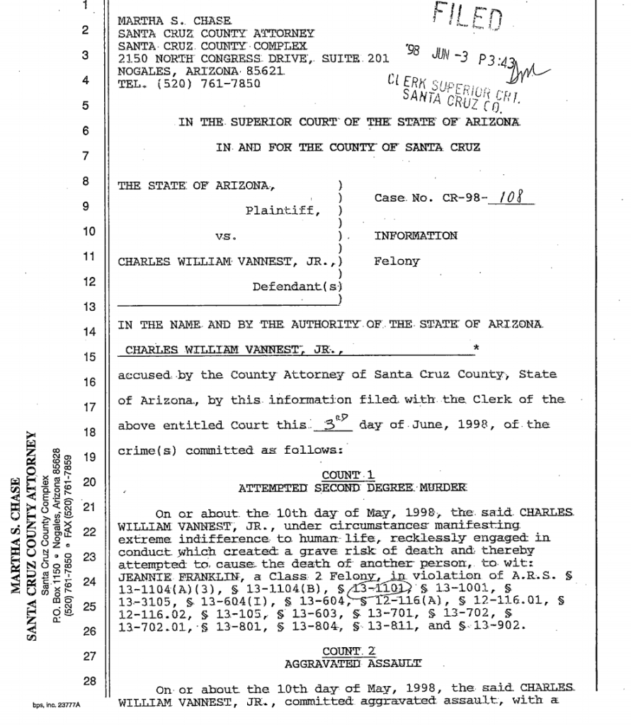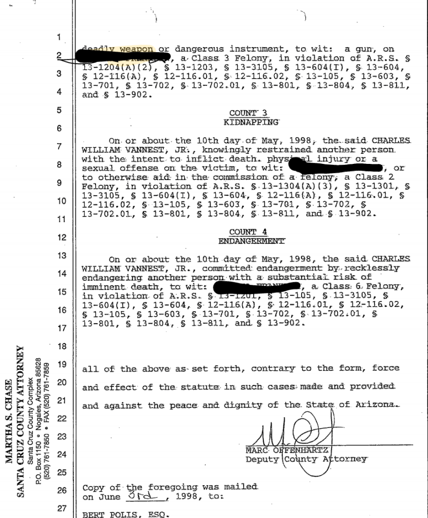 Van Nest was charged with “Kidnapping” and “Attempted Second Degree Murder,” and more after a May 10, 1998 incident where police say Van Nest kidnapped his girl friend and held her at gun point. (SCROLL DOWN TO SEE DOCUMENTS)