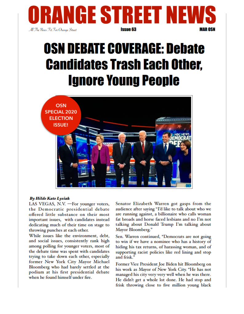 The March 2020 issue of the Orange Street News has hit the streets! This issue is a special ELECTION 2020 Issue with OSN coverage of the debate in Las Vegas and more!