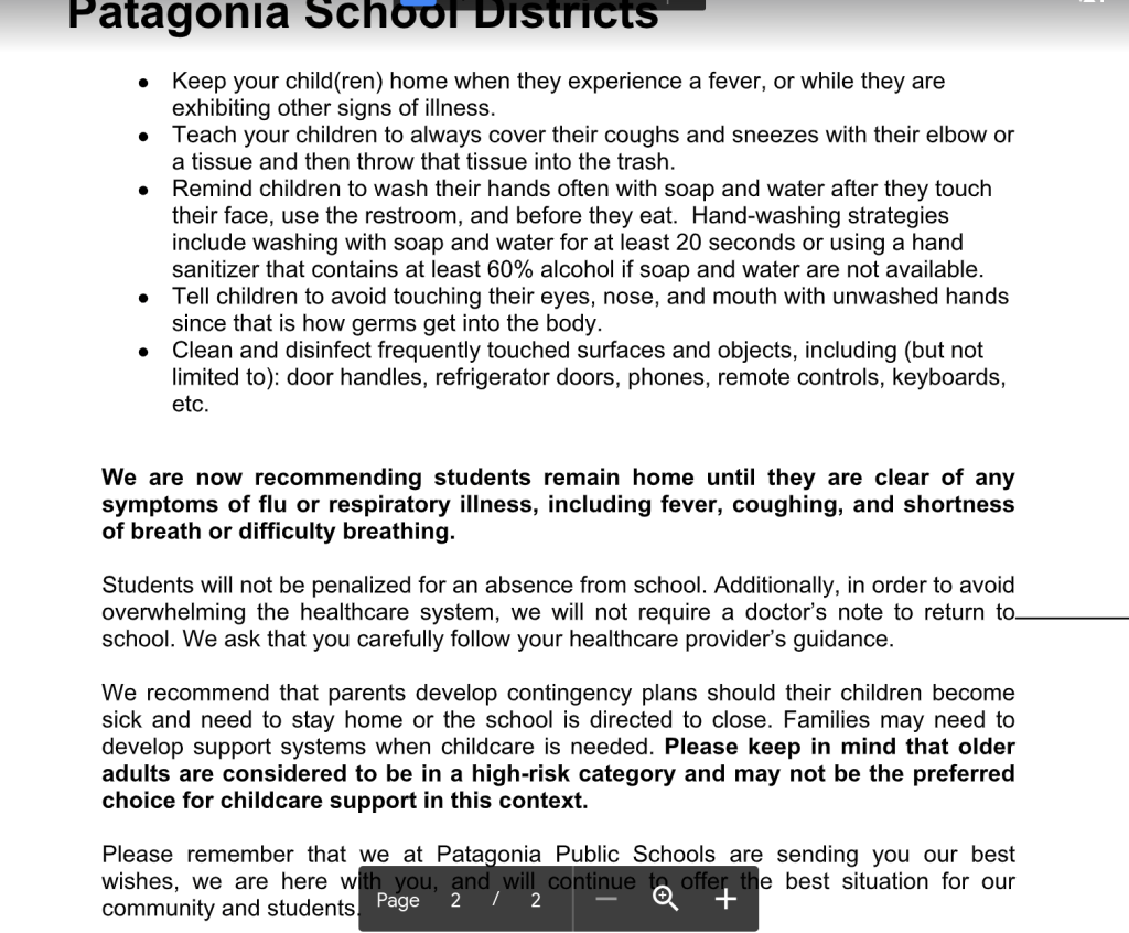 “In an attempt to make informed decisions regarding the health and safety of our schools we are asking that families share with us if anyone that has come into contact with your child/children that has potentially been exposed to the Coronavirus The information will be confidential and is only used for health and safety planning,” read a letter from the Patagonia school district sent out to all parents on Friday.