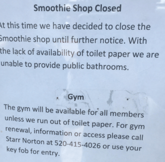A sign posted outside the business read “At this time we have decided to close the Smoothie shop until further notice. With the lack of availability of toilet paper we are unable to provide public restrooms. The gym will be available for all members unless we run out of toilet paper.”