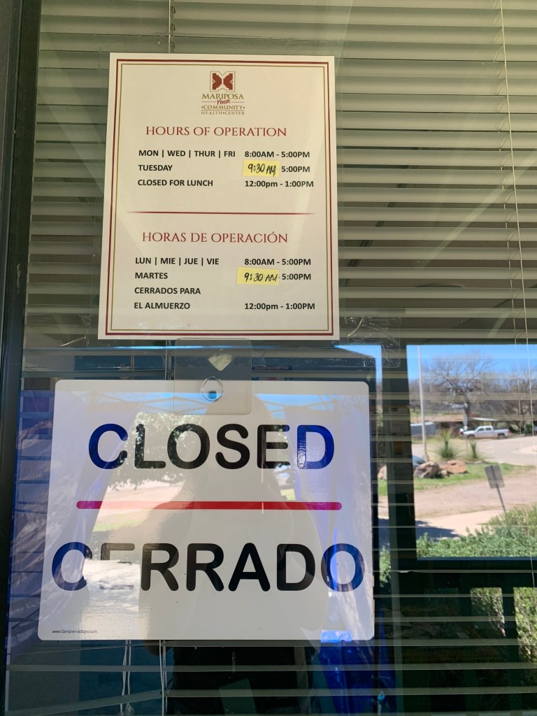 A sign on the door reads that the Patagonia Health Center is closed on Saturdays and Sundays. The next closest facility is the Mariposa Community Health Clinic — nearly 25 minutes away.